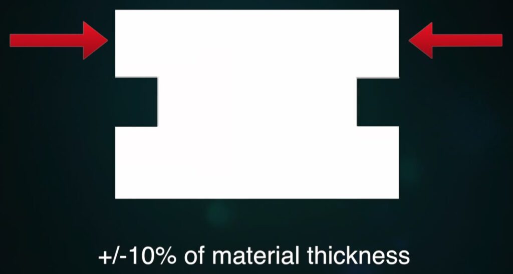 This would correspond to the tightest tolerance requirement for a given part. For all other edge to edge tolerances we would ask for +/-15% of the material thickness. A few exceptions to this rule could apply. For instance the diameter of a hole can be reamed to size as a secondary operation. Also for characteristics we call “like edges”, tolerances can be held much tighter