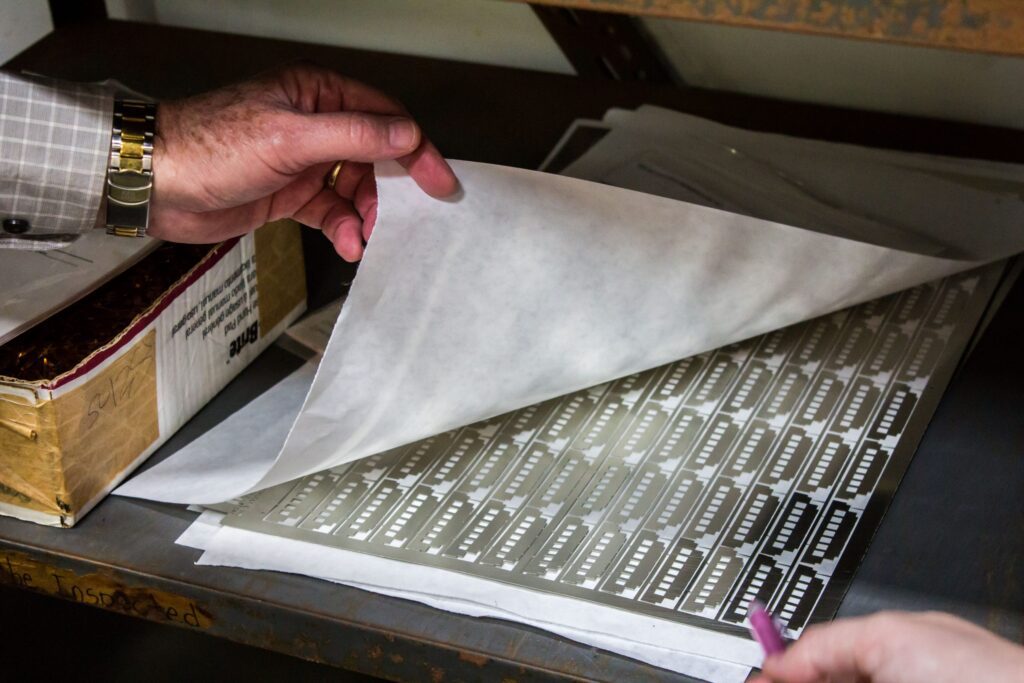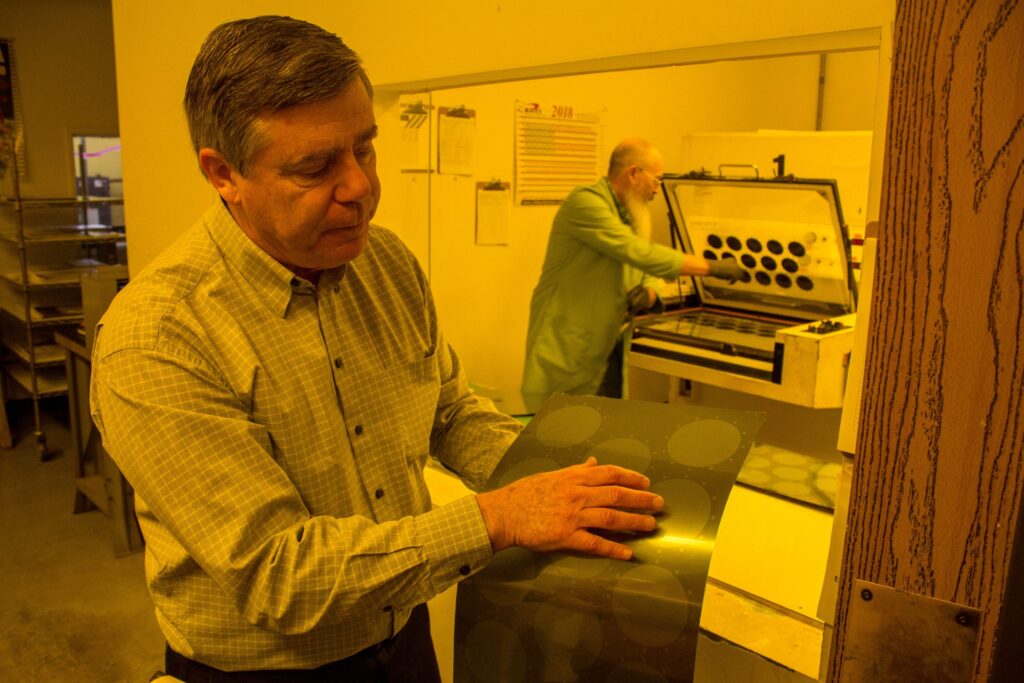 Once it is coated, the sheet is put into an exposure unit. It’s placed between two pieces of film, which have been designed based on the files submitted by the customer. The sheet is exposed to UV light on both sides. When light touches the resist it becomes hard or polymerized, and areas shaded from light remain soft.